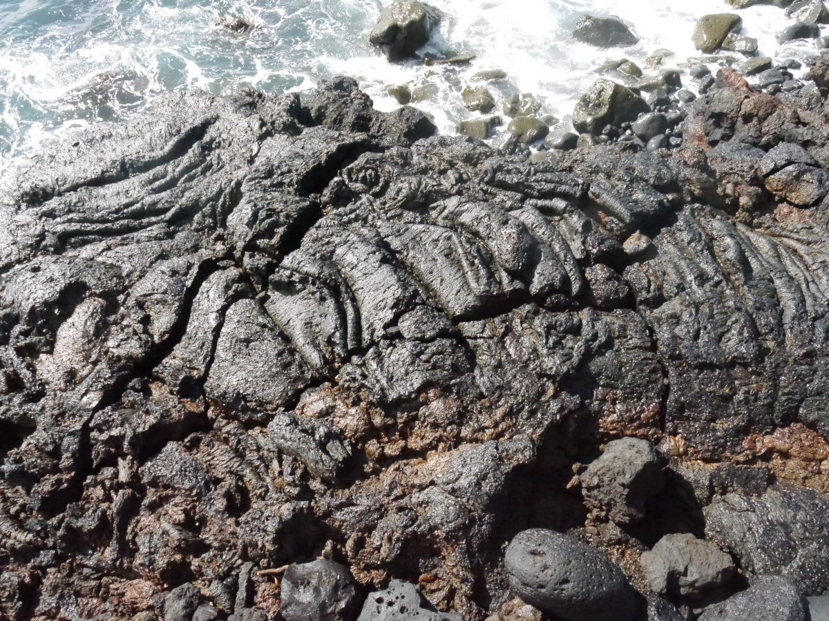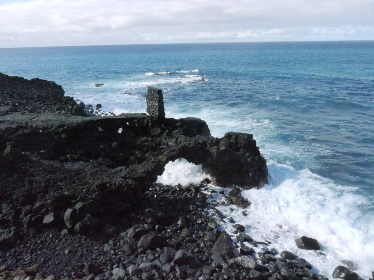 Der Strand ist sehr steinig, am nördlichen Ende erreicht man den Lavastrom, der sich hier ins Meer ergoss. Die Lava ist bröckelig und porös. Es sieht trostlos aus, außer dem Wind und den Wellen ist nichts zu hören. Kein Leben hat sich bisher hier etablieren können.
