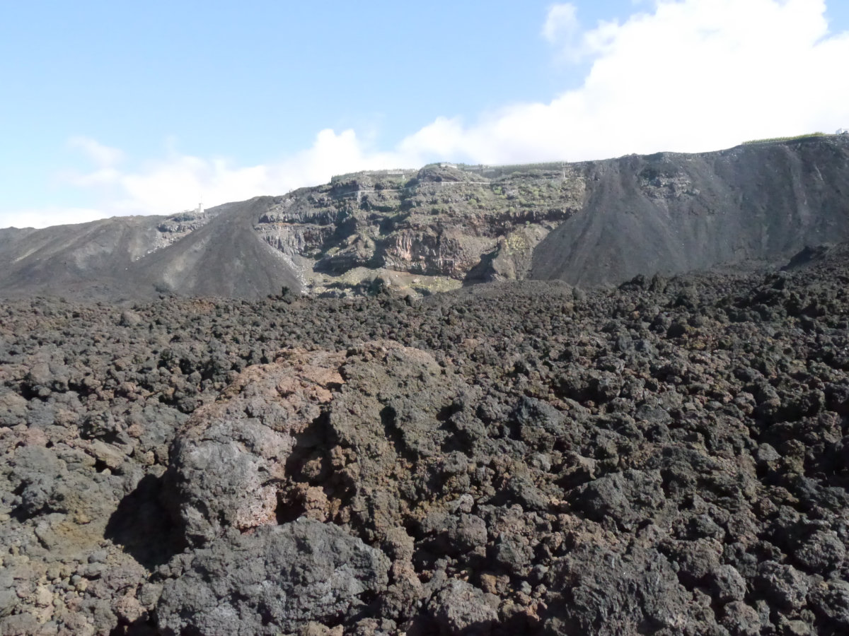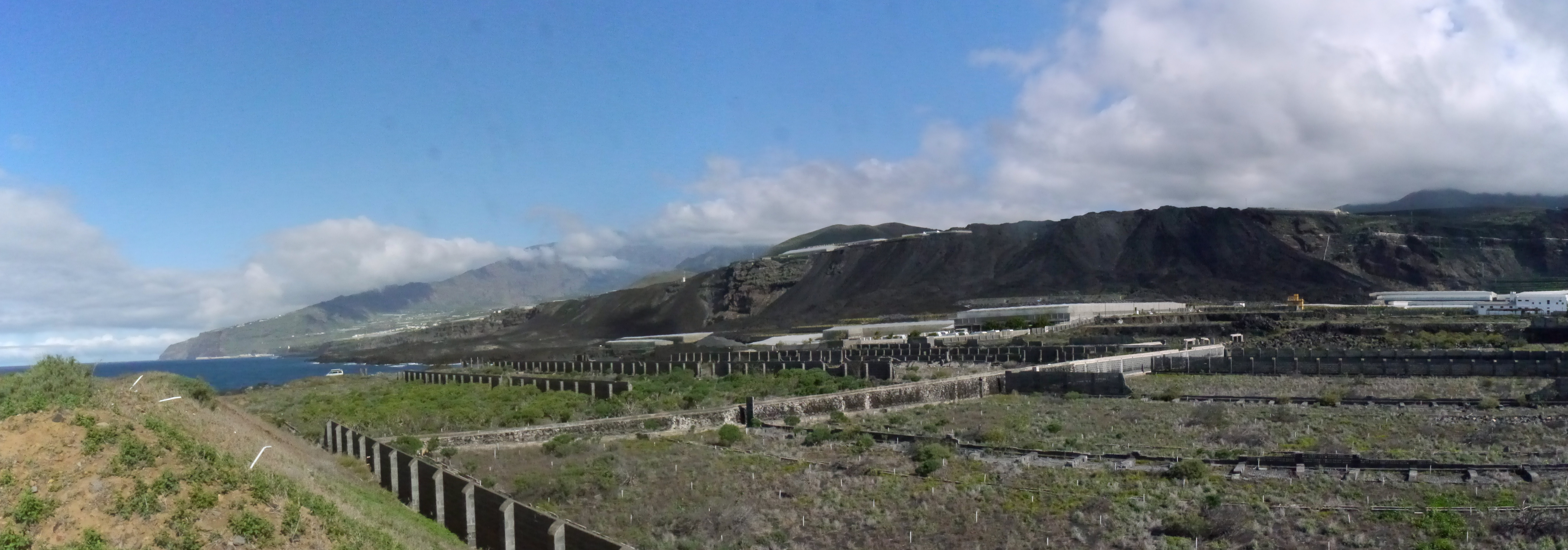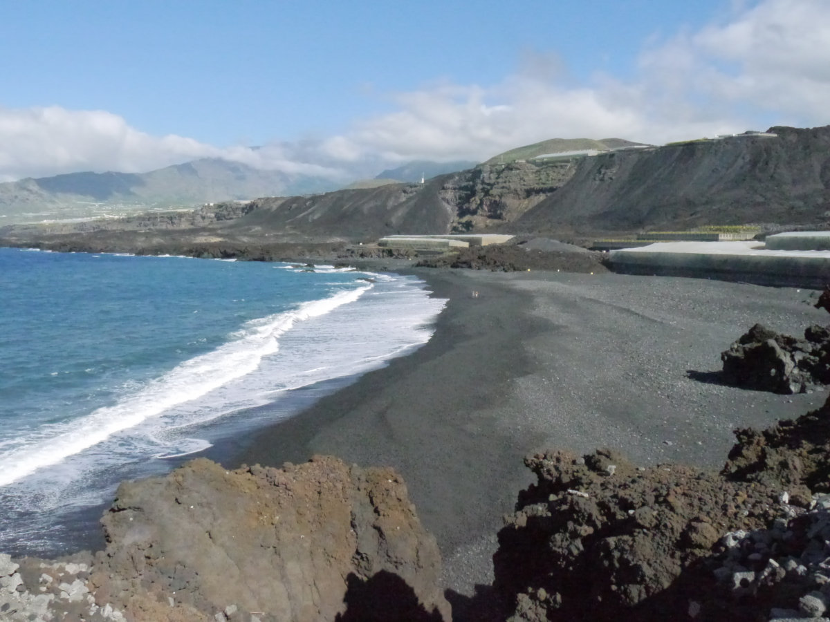 An der Küste entdeckt man die Ruinen eines Hafens oder einer Verladerampe. Schaut man Richtung Inselmitte, erkennt man den Lavastrom vom 2021. Einige Bananenfelder fielen der Lava zum Opfer, auch der Strand blieb verschont.