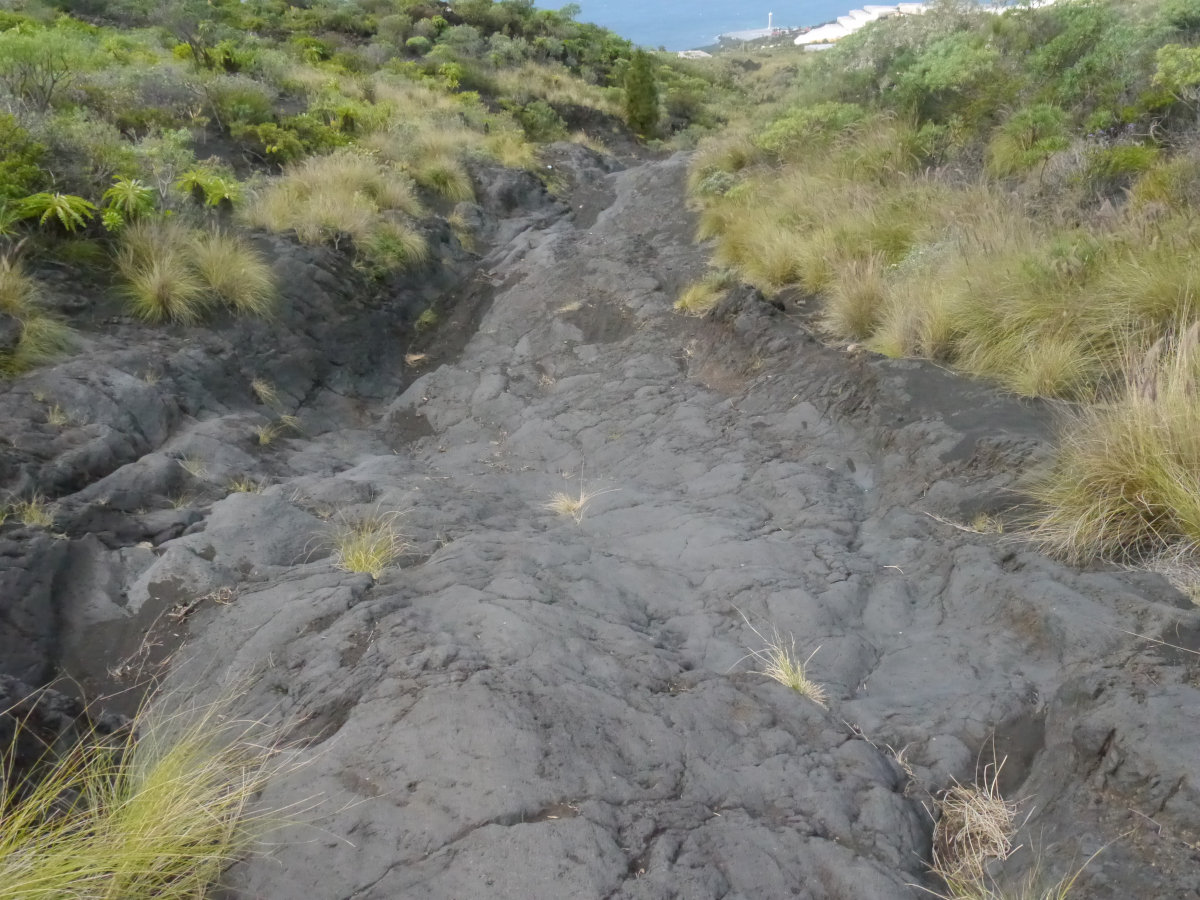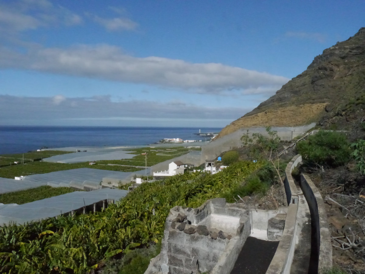 Zurück geht es einen kurzen Teil auf dem Camino Cuesta Blanca, bis man rechts in den Camino La Dichose einbiegt. Der Wasserlauf Barranco de los Hombres wird passiert, man biegt an der Kreuzung links ab, folgt kurz der Straße und kann dann im dem Bach laufen. Das letzte Stück ist etwas verwildert, plötzlich steht man an der Felskante und kann Puerto Naos und die Küste überlicken.