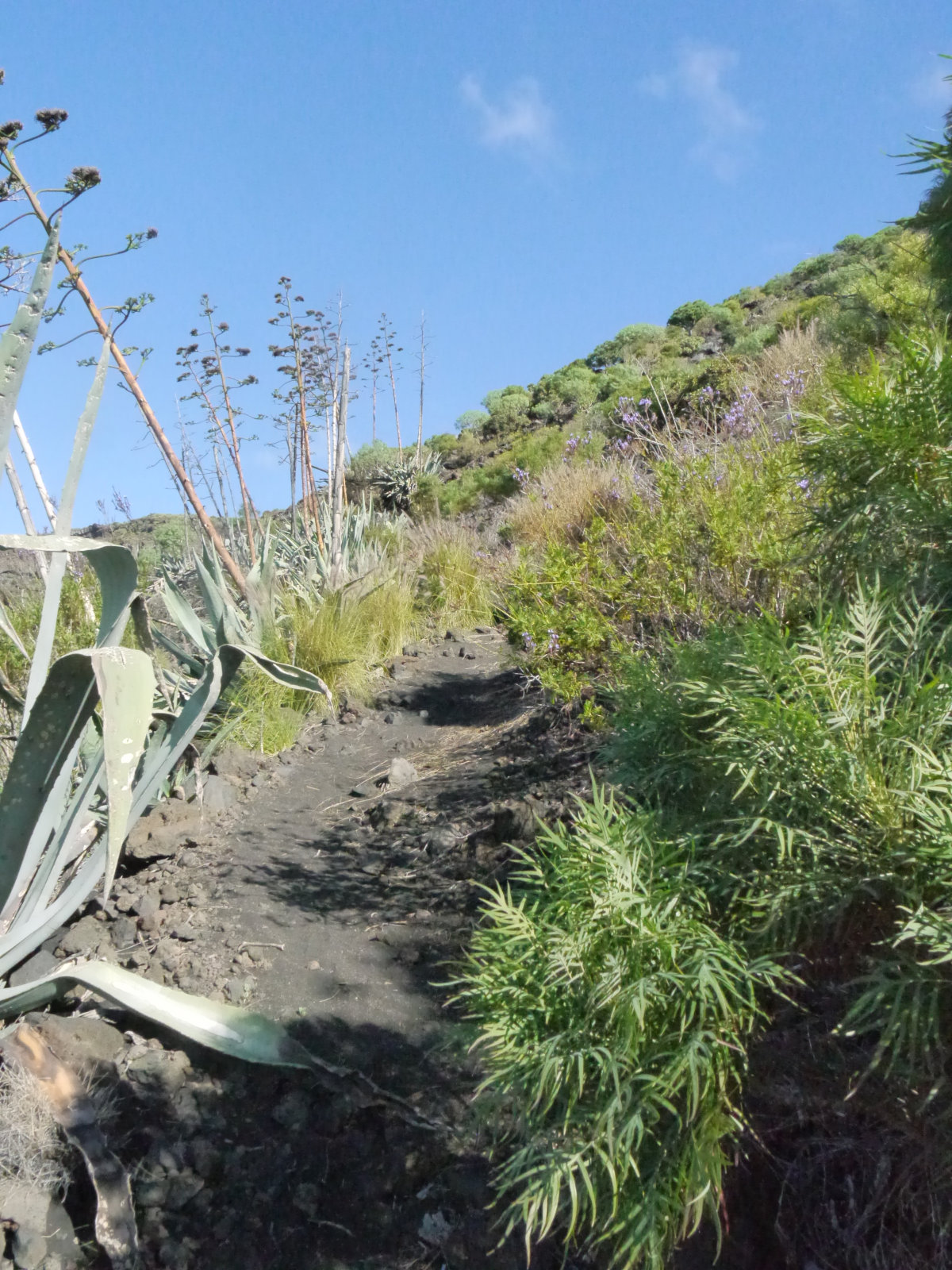 Die Felskante kommt immer näher, Schatten gibt es hier keinen. Oben sieht man die nächste Bananenpflanzung. Weiter oben wird die Vegetation dichter, der kanarische Lavendel blüht und duftet aromatisch.
